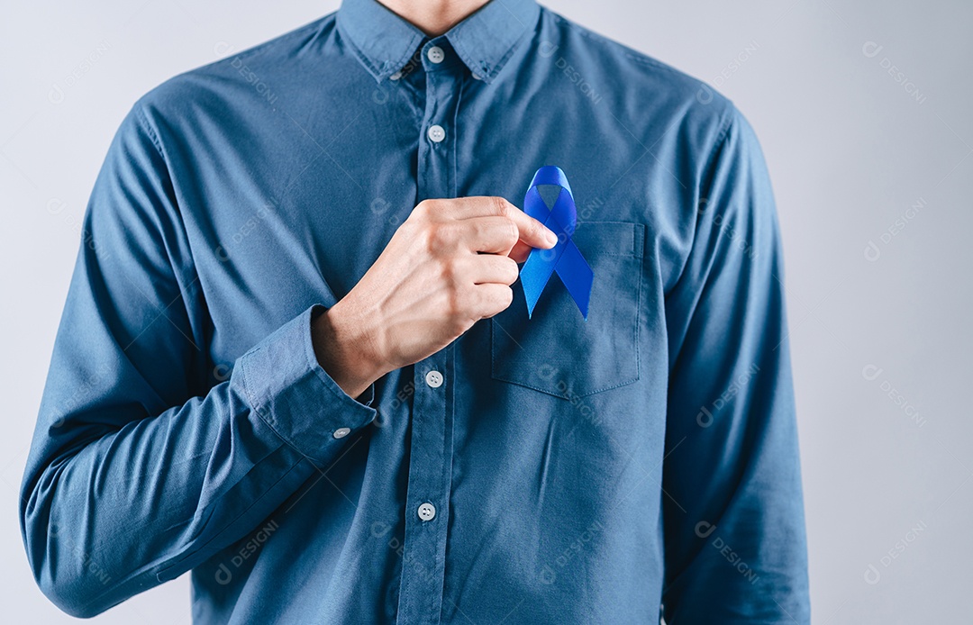 Mãos de homens segurando fita azul para apoiar as pessoas com câncer