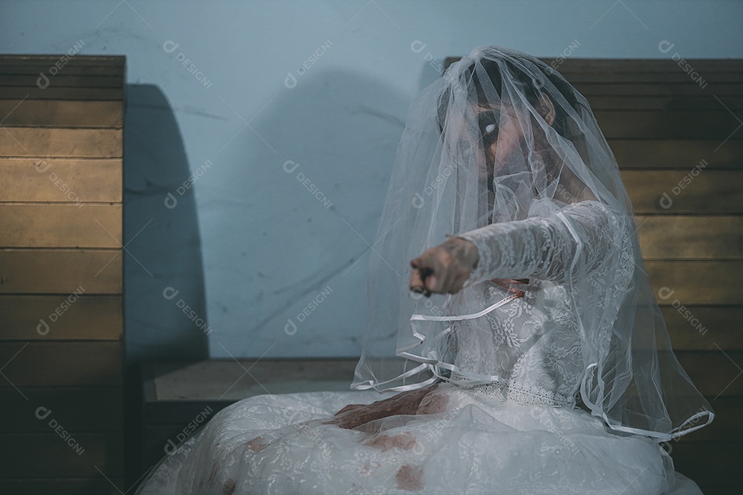 O retrato da mulher asiática compõe a morte da noiva fantasma e o sangue, o horror é a cena de terror assustador da escuridão para o fundo, conceito do festival de Halloween.