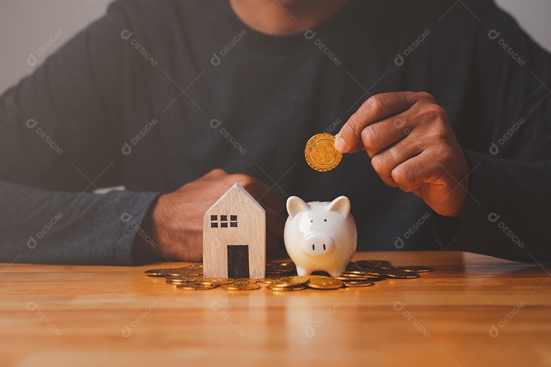 Empresário colocando moeda no cofrinho, propriedade da casa e ícone da família na mesa, doação, economia