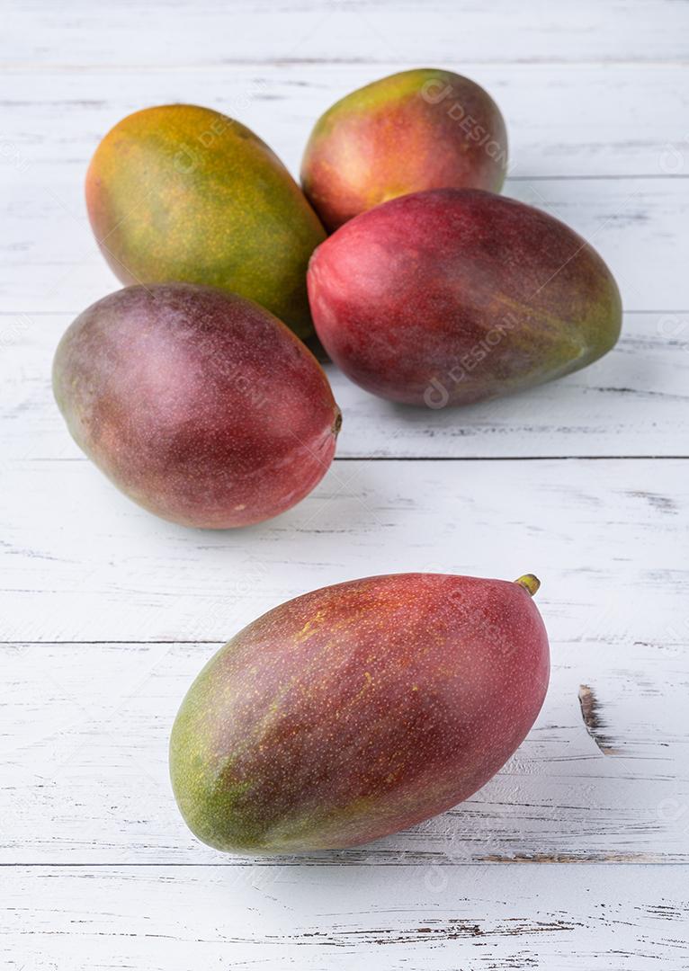 Um grupo de mangas maduras sobre mesa de madeira branca