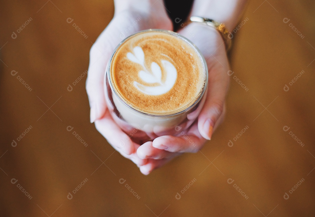 Feche as mãos da mulher barista segurando uma xícara de café cappuc...