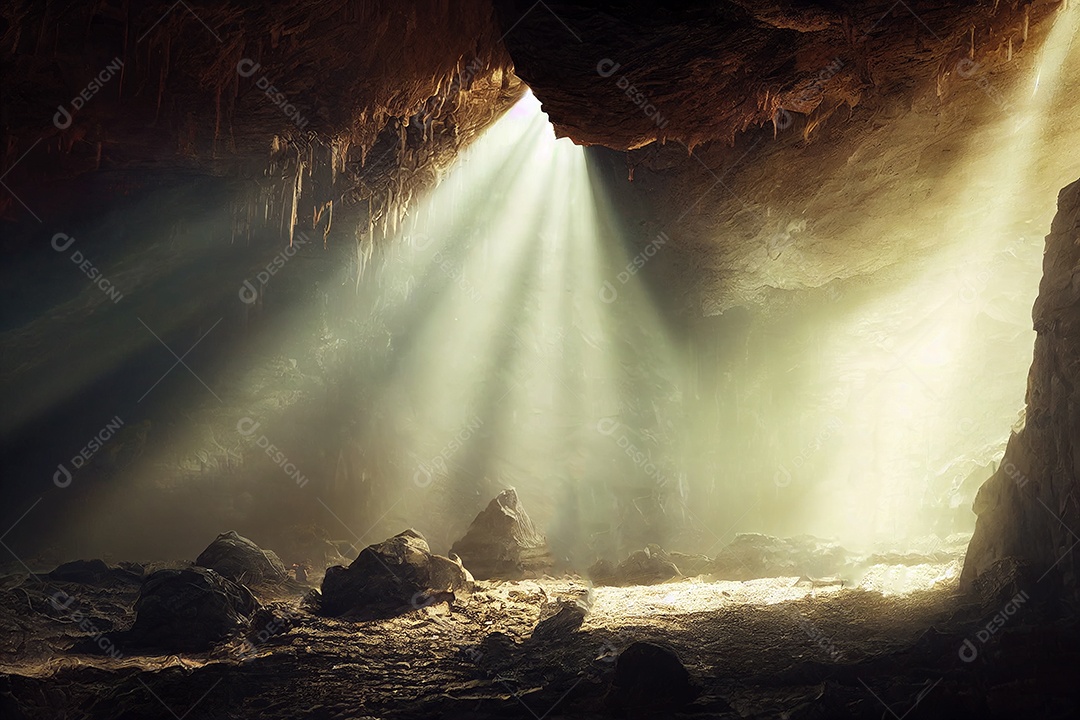 Luz dramática na paisagem escura da caverna, misteriosa e surreal