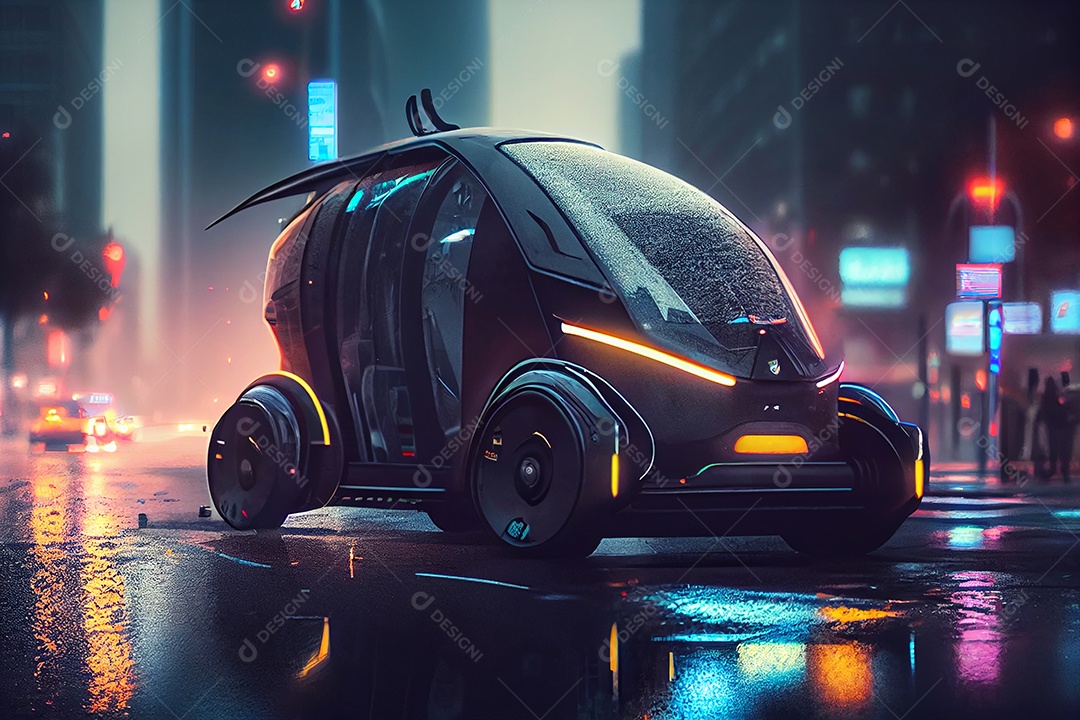 Carro futurista andando sobre ruas e vias iluminada cidade
