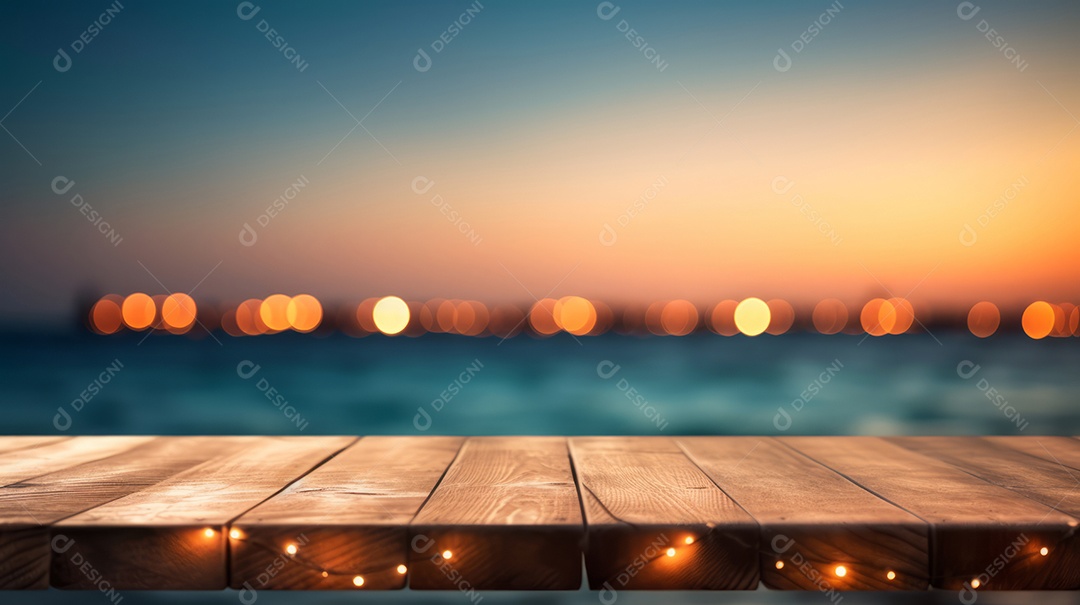 Mesa de madeira com desfoque bokeh luz mar e céu na praia Verão a estação mais quente.
