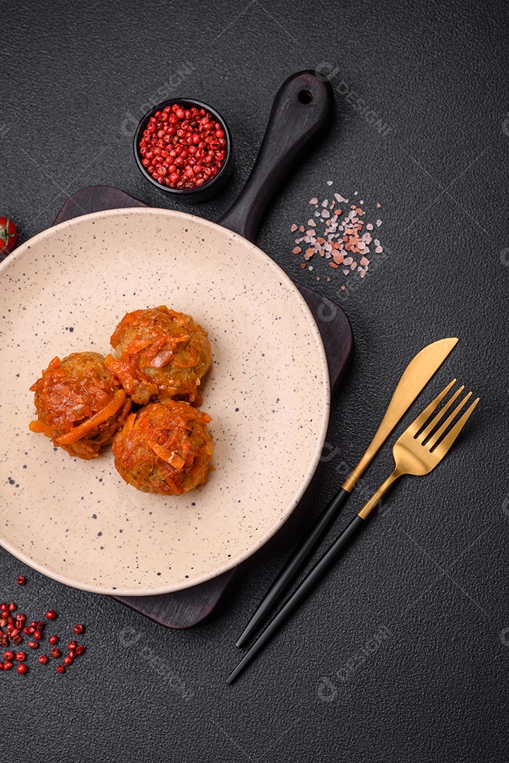Deliciosas almôndegas frescas de carne picada ou peixe com molho de tomate, cenoura, cebola, sal e especiarias sobre um fundo escuro de concreto