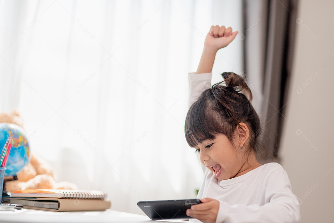 Menina asiática usando um telefone de perto, distraída de estudar, sentada em uma mesa com notebooks, uma criança bonita se divertindo com um smartphone, assistindo ao webinar, educação em casa