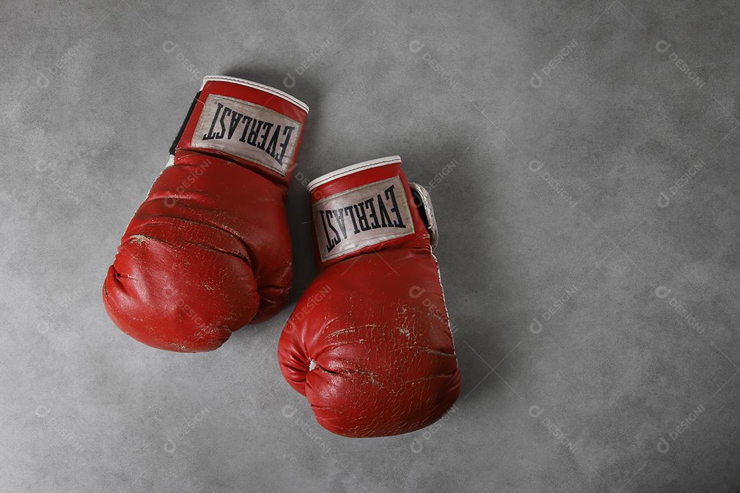 Luvas de boxe velhas Eternas no chão do ginásio após o treino. Fundo cinza concreto grunge.