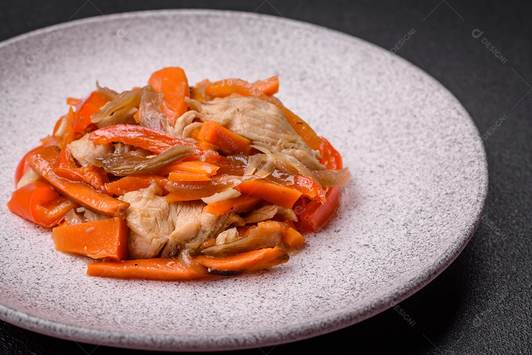Delicioso ensopado fresco com frango ou peru com fatias de pimentão e cenoura com sal e especiarias sobre um fundo escuro de concreto