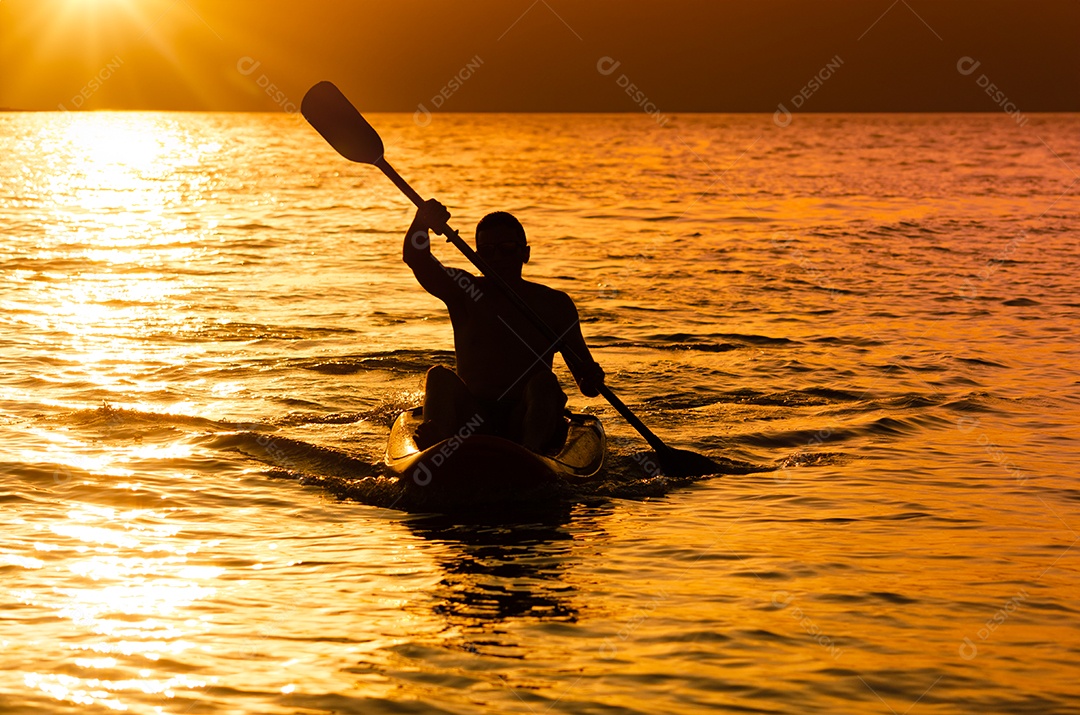 Silhueta de homem ao pôr do sol remando em seu caiaque na costa do Brasil