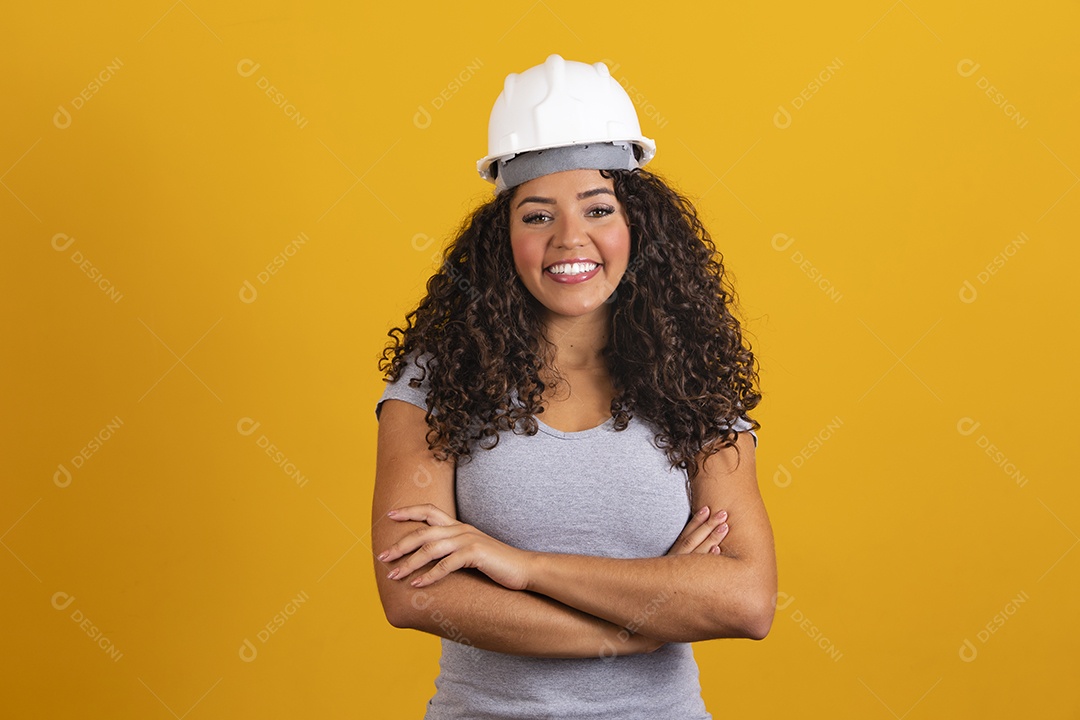 Linda mulher jovem garota cabelo cacheado engenheira fundo isolado amarelo