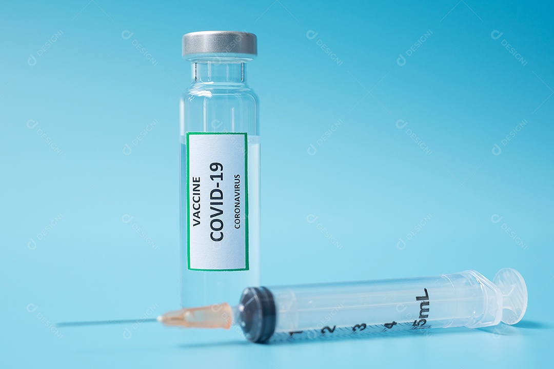 Frasco de vacina COVID-19 e seringa de agulha de injeção contra inf...