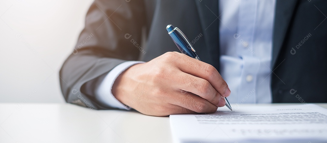 homem assinando documentos do contrato após a leitura, homem segurando a caneta e aprova no relatório de negócios