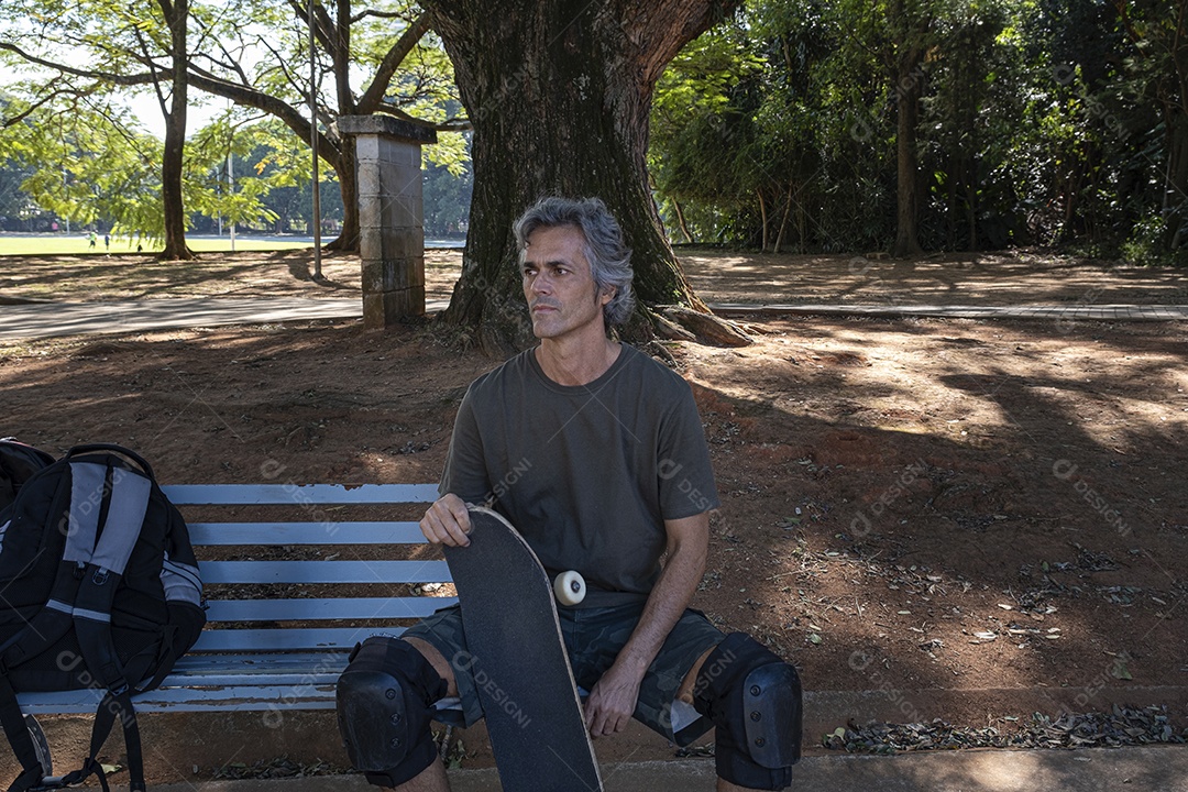 Homem sentado com skate em banco de praça tropical