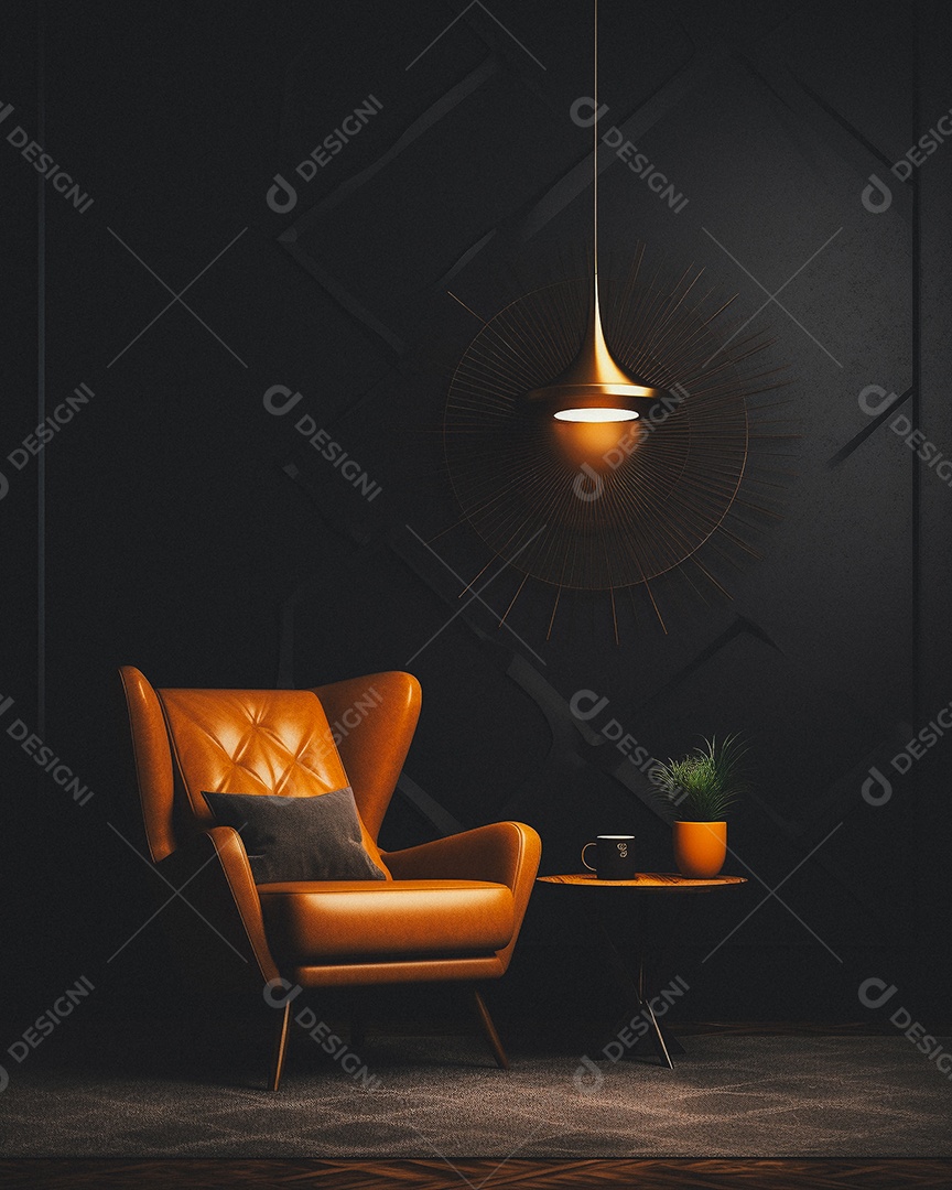 Maquete 3D do interior da sala de estar em tons quentes com poltrona no fundo vazio da parede marrom claro