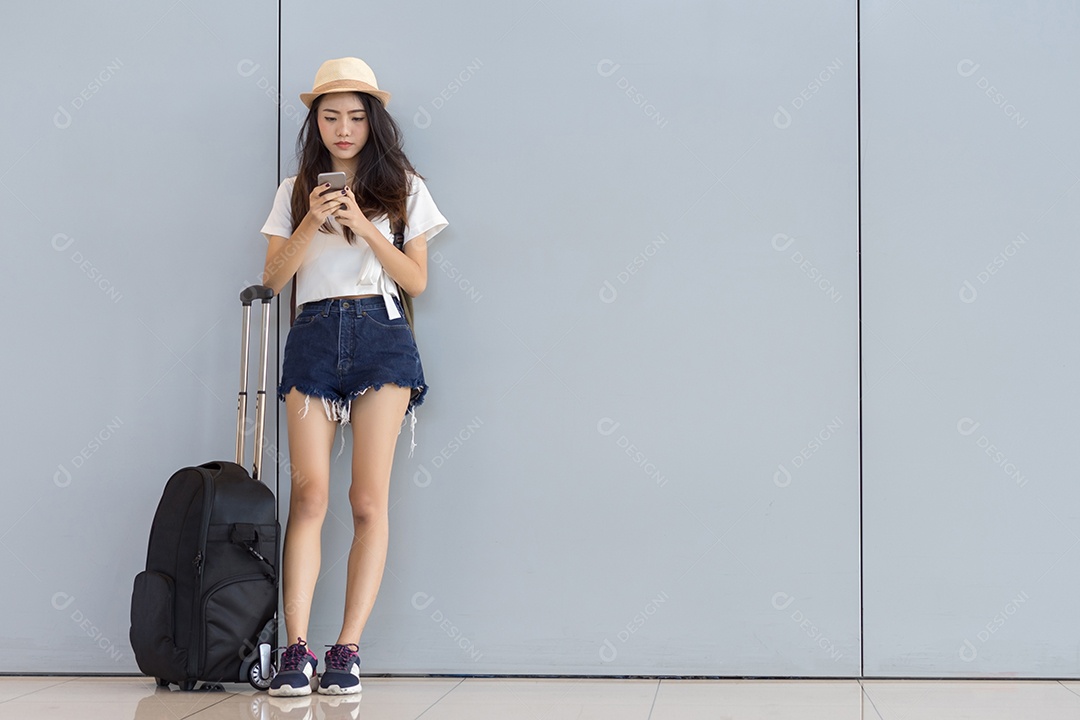 Adolescente asiática parada no terminal do aeroporto com mala de bagagem e mochila para viajar