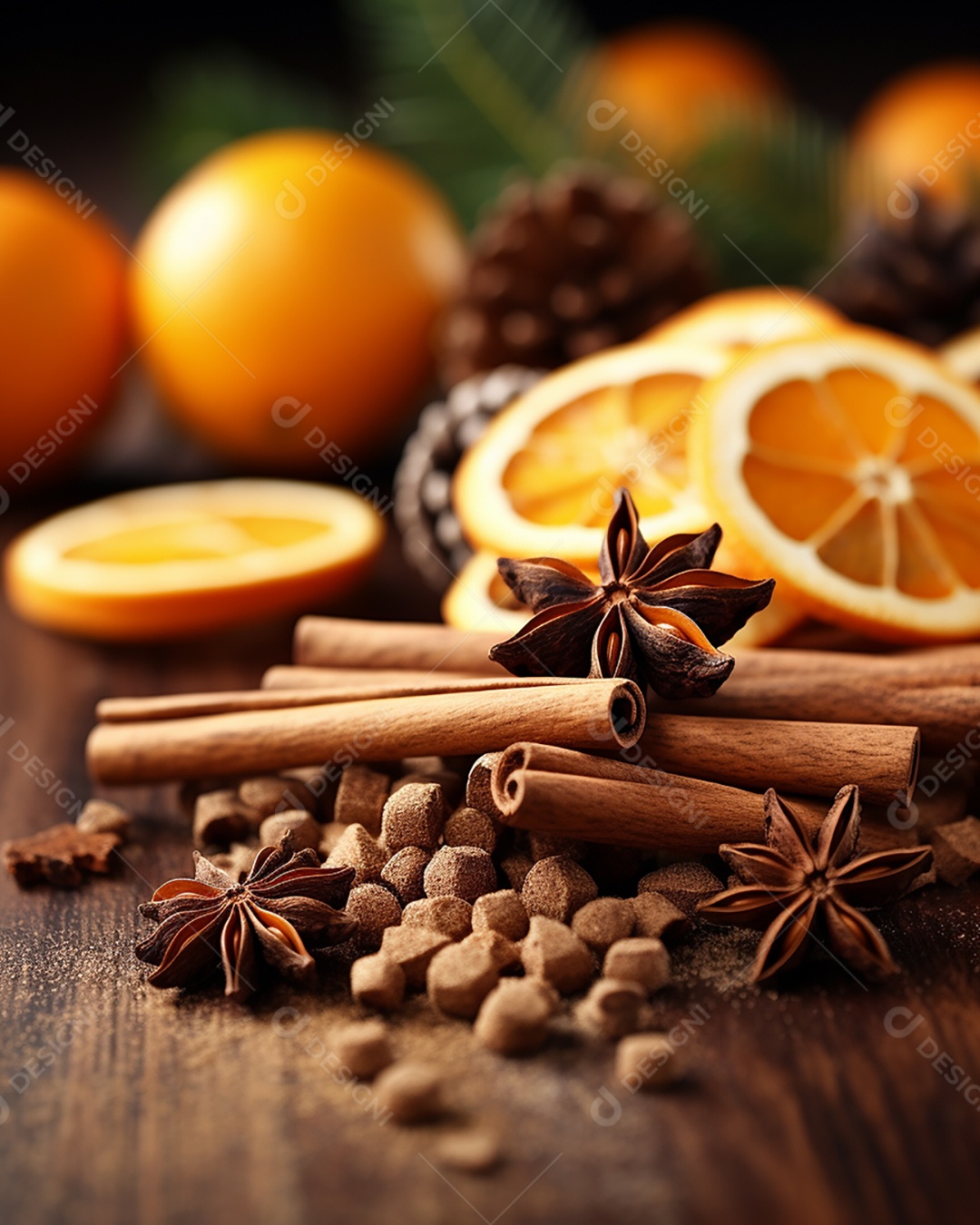 Especiarias tradicionais de Natal e fatias de laranja secas em fund...