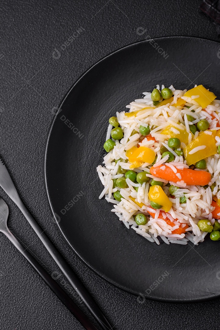Delicioso arroz cozido branco fresco com vegetais cenouras, pimentões e feijões de espargos em uma placa cerâmica sobre um fundo escuro de concreto