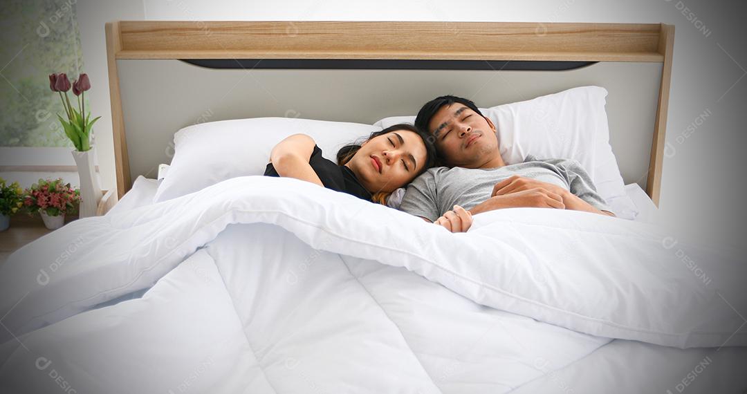 Jovem casal apaixonado na cama e casal romântico apaixonado na hora de dormir e conceito de felicidade