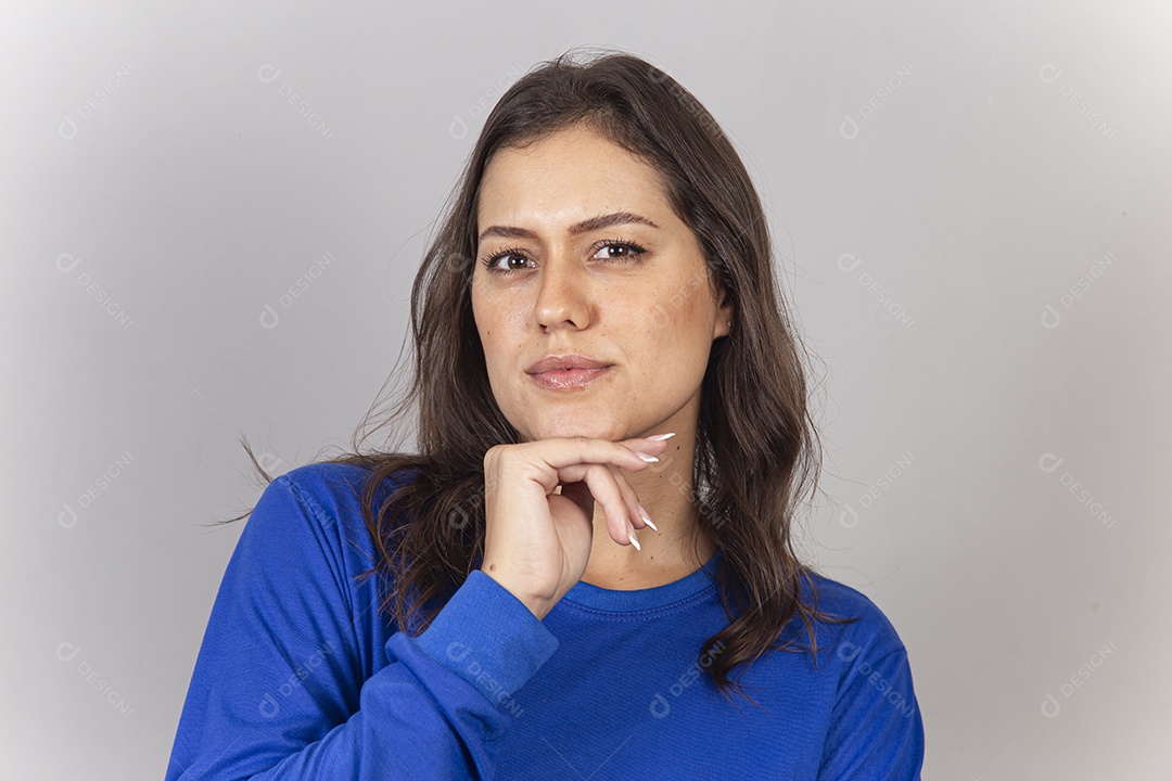 Linda jovem mulher vestida com moletom azul com a mão embaixo do queixo.