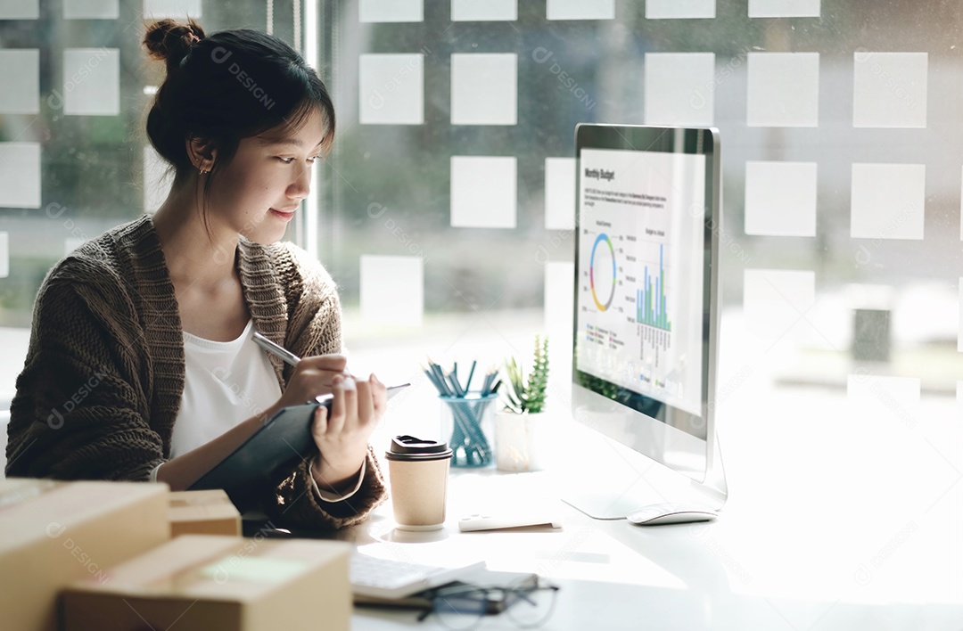 Alegre mulher asiática trabalhando no escritório usa computador
