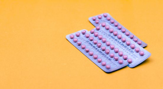 Pílulas anticoncepcionais de emergência em blister em fundo desfocado