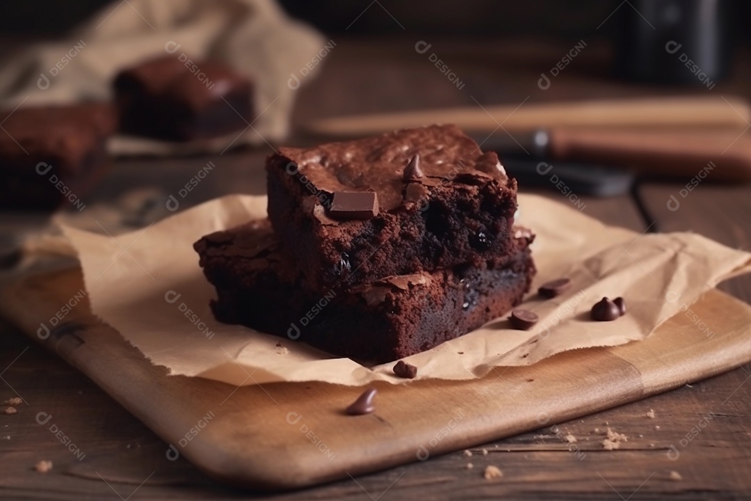 Pedaços quadrados de brownie cortam fatias sobre a mesa de madeira ...