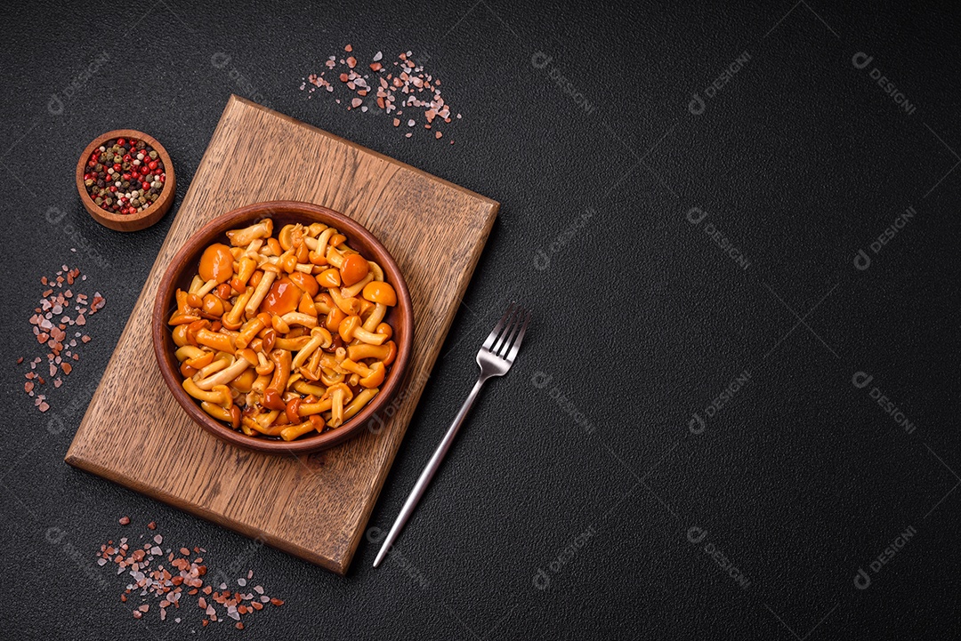 Deliciosos cogumelos em conserva com sal e especiarias em uma placa de cerâmica sobre um fundo escuro e texturizado
