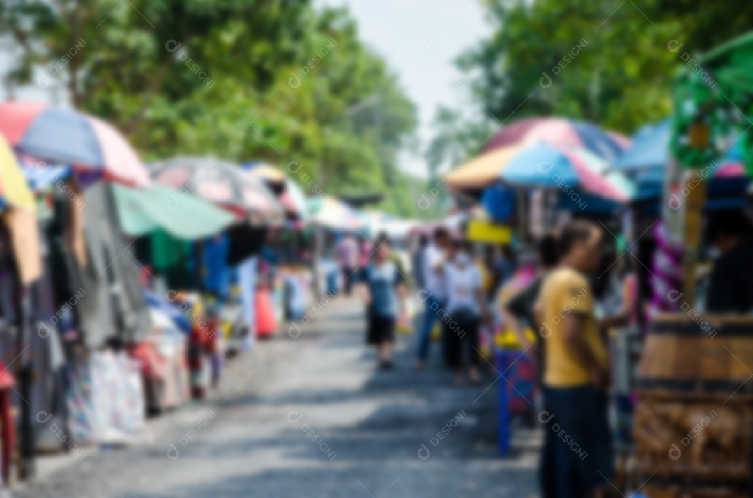 Pessoas desfocadas abstratas andando e fazendo compras no mercado de rua durante o dia.