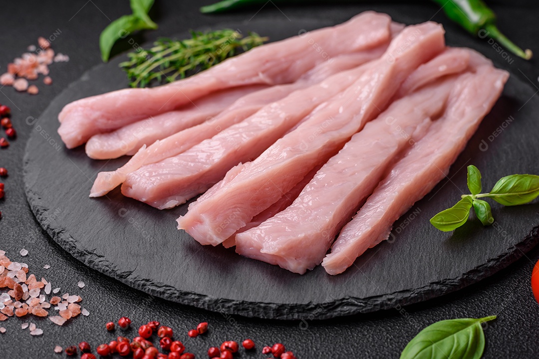Filé de frango ou peru cru cortado em tiras com especiarias e ervas...