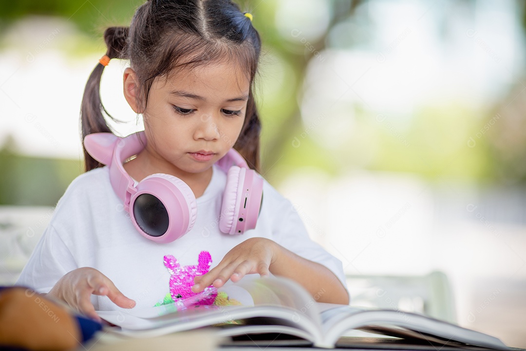 De volta à escola. Menina asiática lendo um livro. Alunos do ensino fundamental depois das aulas aprendendo lição de casa.