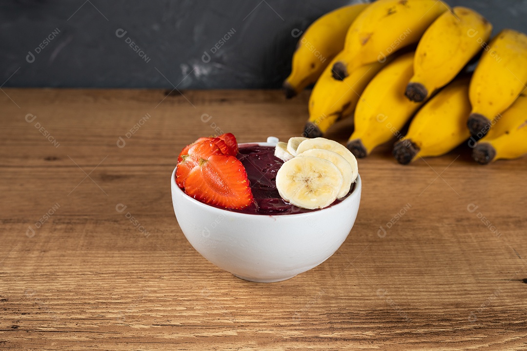 Tigela branca de açaí brasileiro congelado com paçoca, morango e banana.