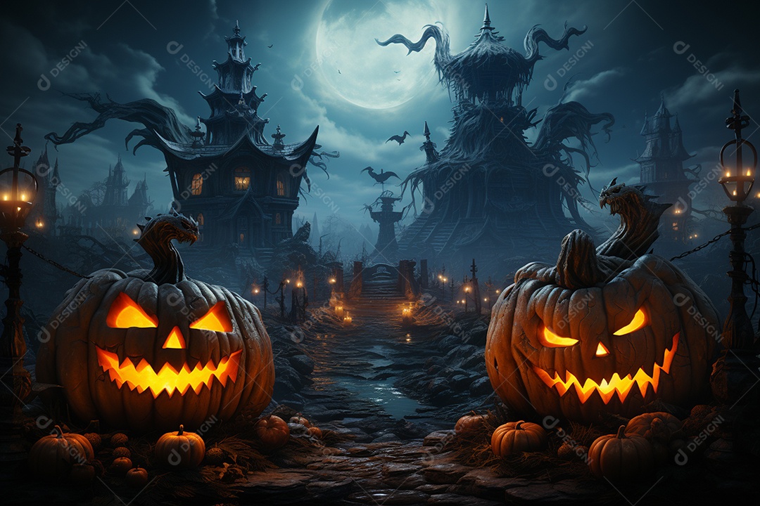 Fundo de Halloween com abóboras e casa assombrada - renderização 3D. Fundo de Halloween com abóbora malvada. Floresta noturna assustadora e assustadora