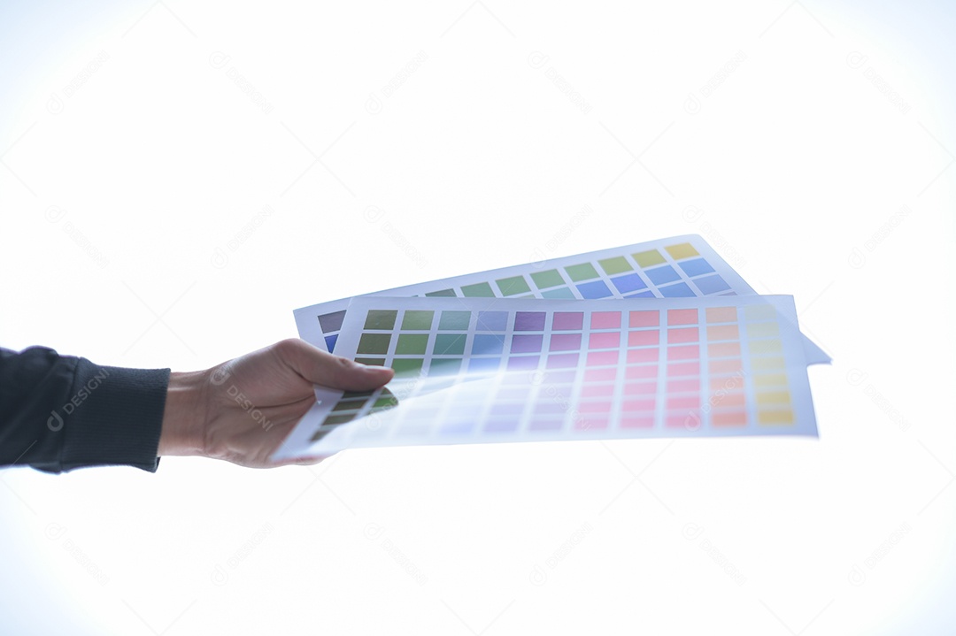 Mão de homem de negócios segurando uma mesa de papel de teste de cor. pano de fundo branco