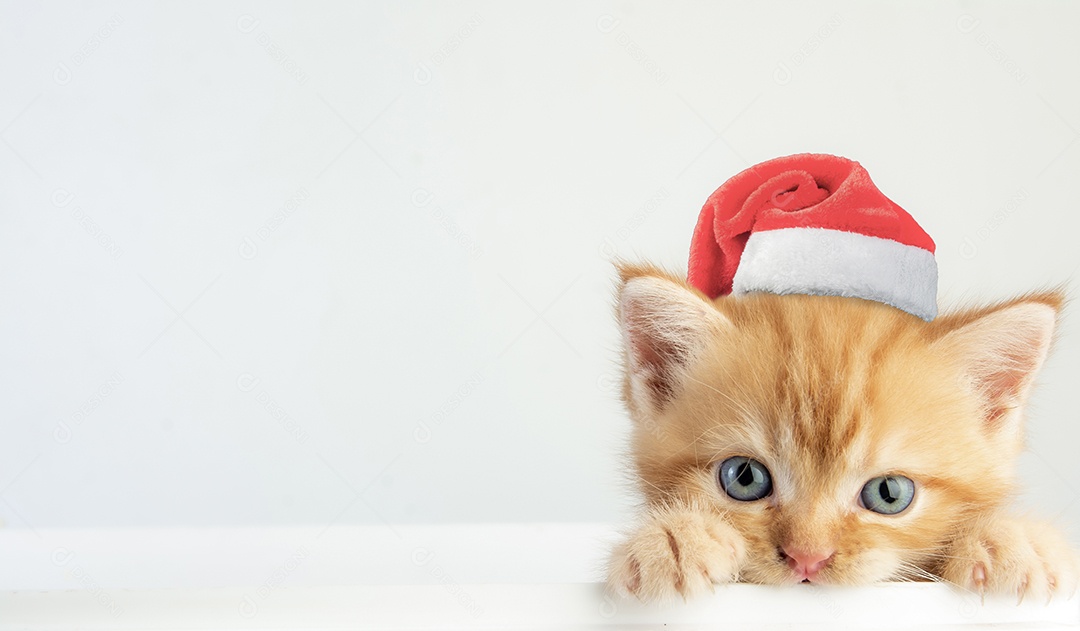 Gato malhado gatinho bonito com chapéu de natal em fundo branco