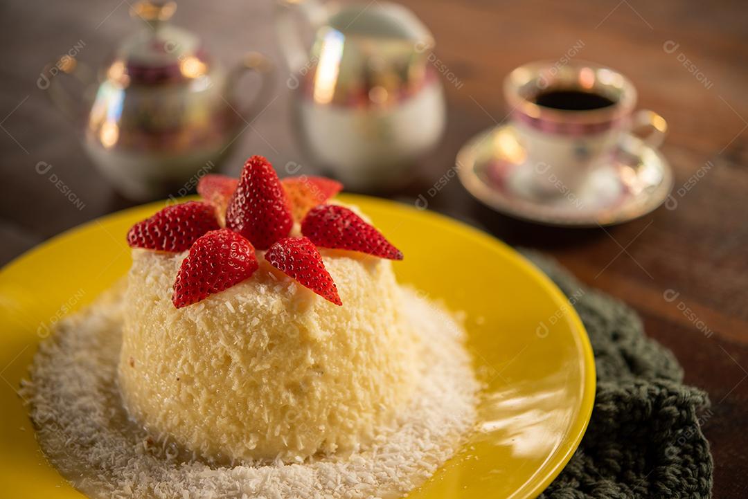 Massa de tapioca e bolo de coco, decorado com morangos, servido na mesa com café. Gastronomia, sobremesa.