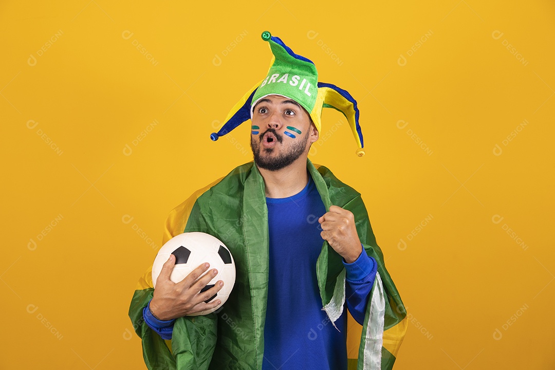 Homem jovem torcedor brasileiro sobre fundo amarelo