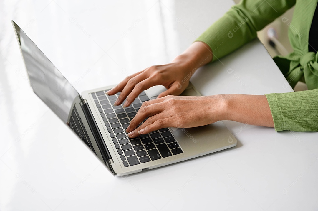 Closeup da mão de uma mulher trabalhando no escritório em casa e digitando no teclado. Tema de negócios e tecnologia.