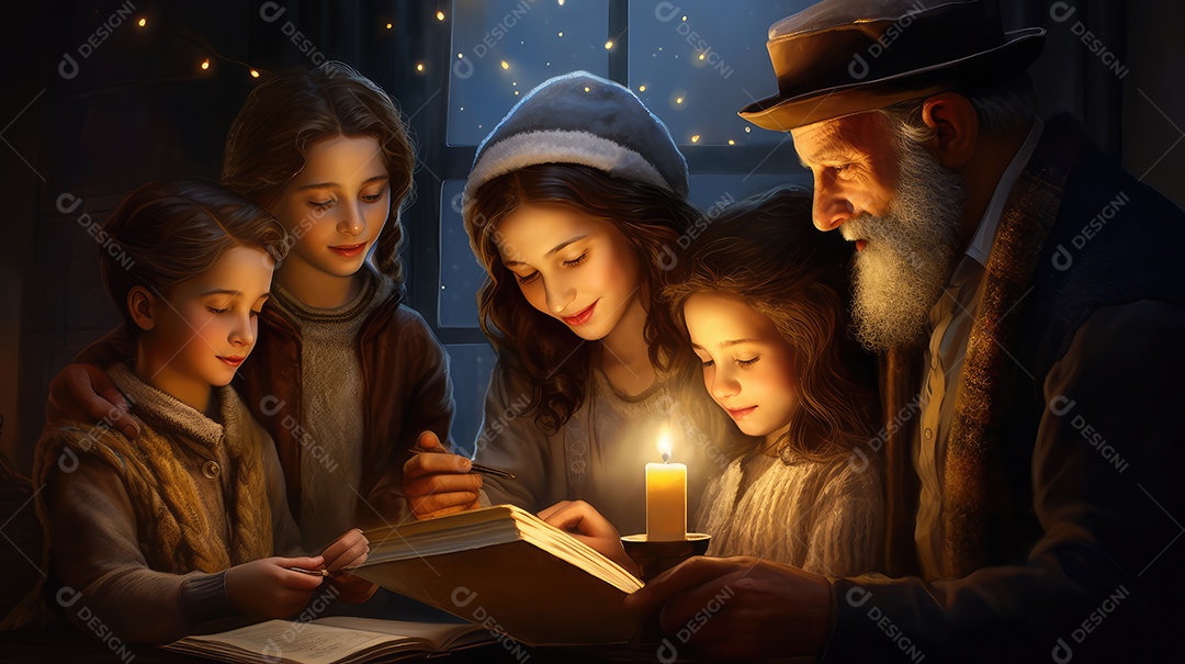 Família se divertindo jogando Dreidel durante o Hanukkah, cores vib...