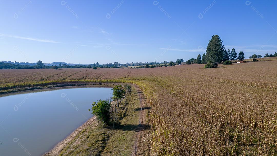 Vista aérea de um milharal na zona rural Em uma fazenda Com um lago...