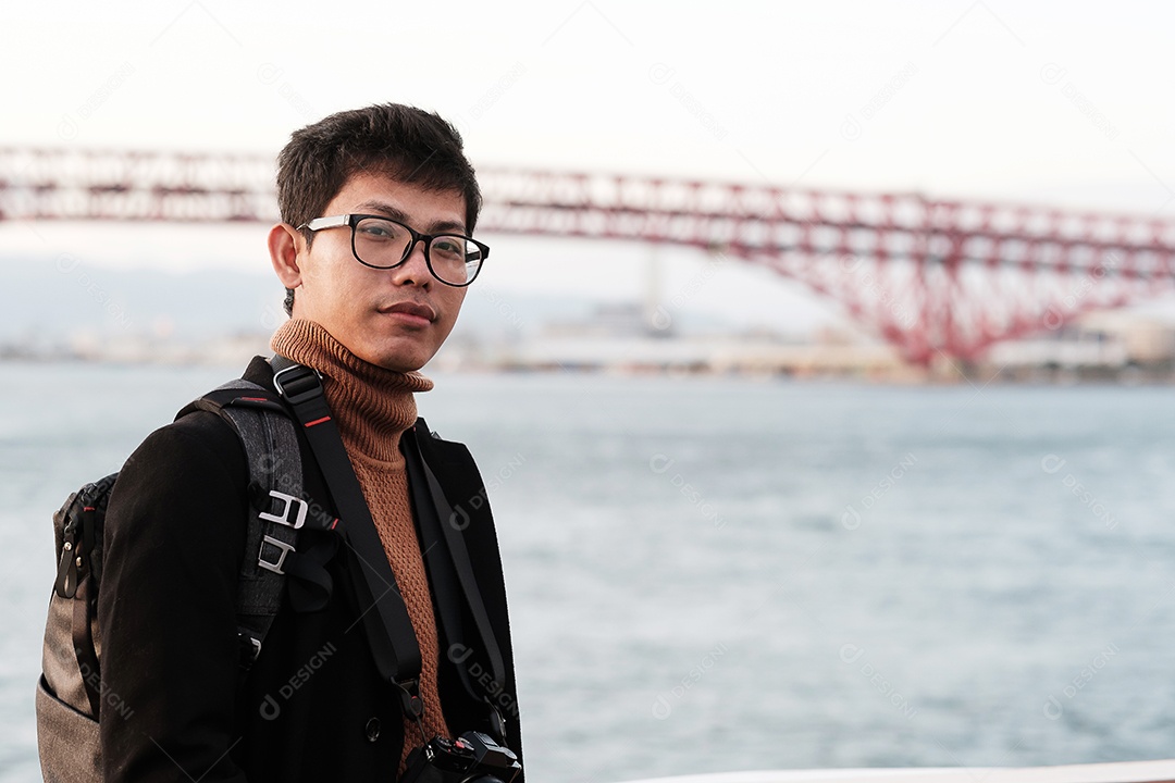Homem feliz de casaco e câmera, viajante asiático desfruta e vista ...