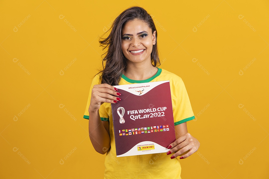 Linda mulher jovem brasileira segurando álbum da copa do mundo futebol