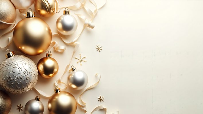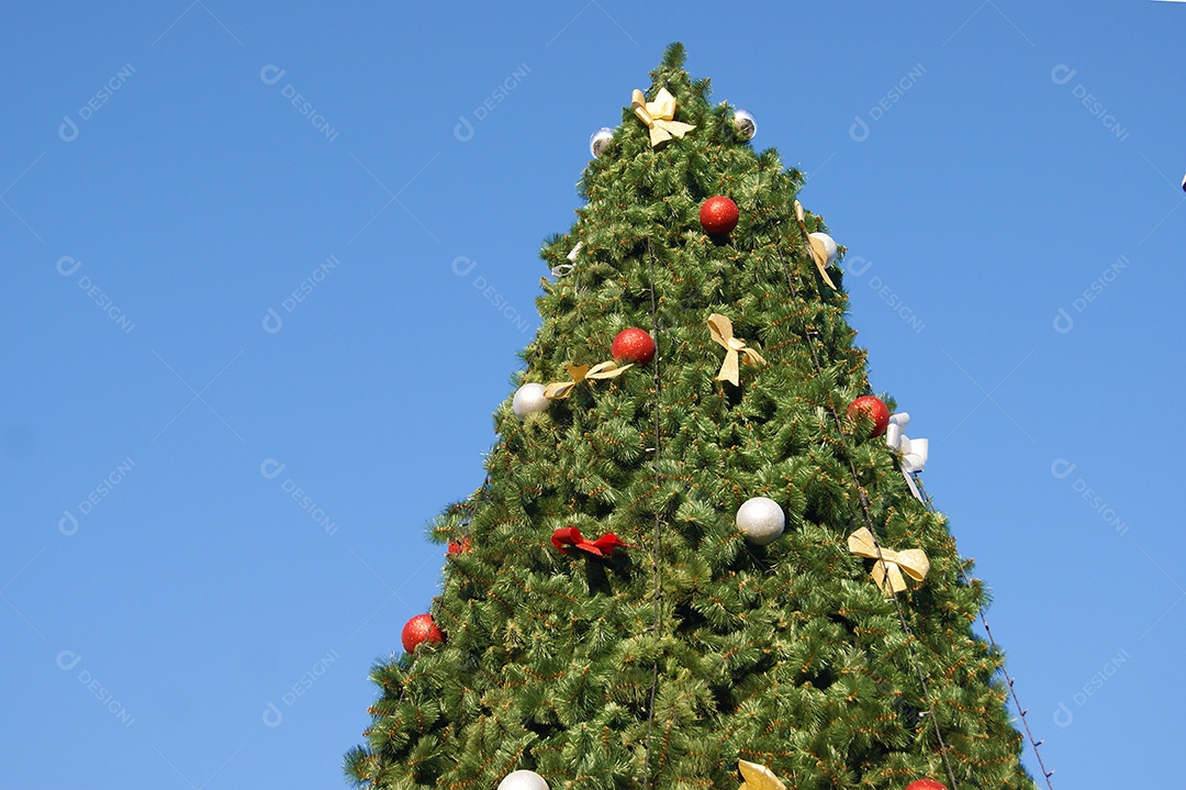 Árvore de natal enfeitada e céu azul atras
