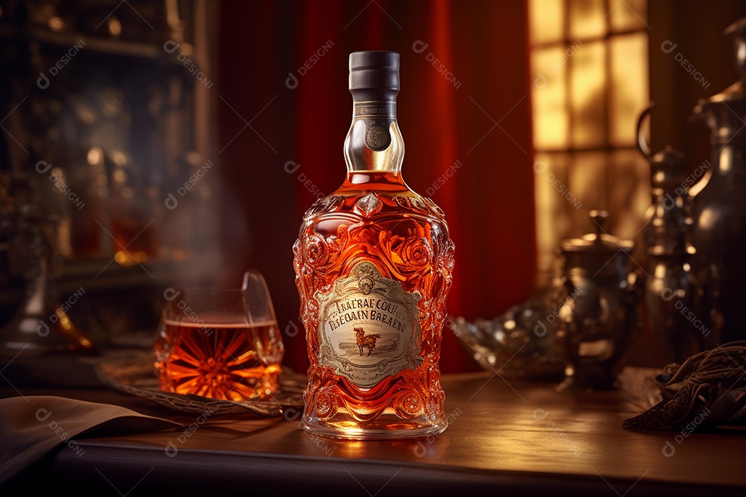 Garrafa e copo de rum ou uísque sobre mesa de madeira