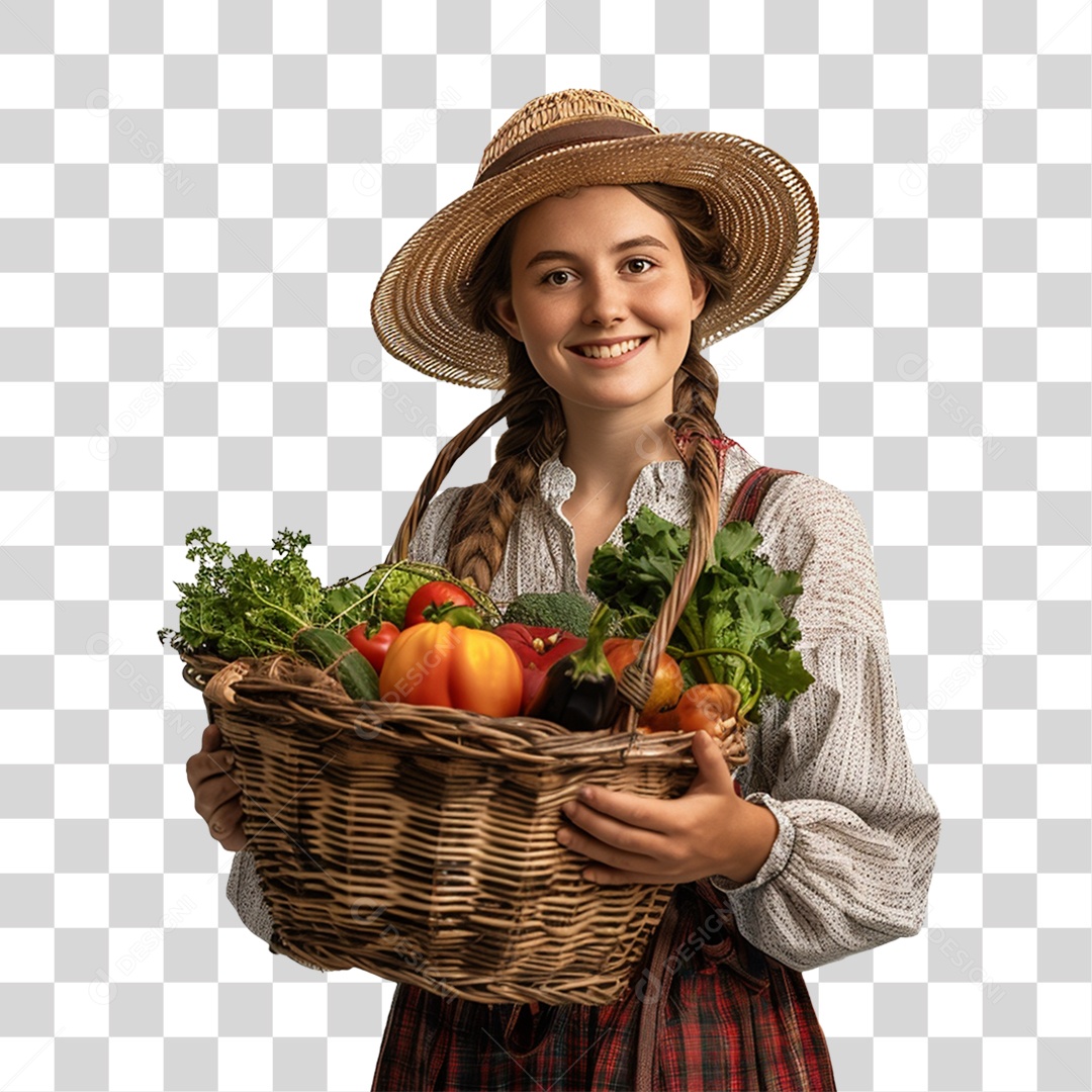 Mulher Fazendeira com Cesta de Frutas e Legumes PNG Transparente