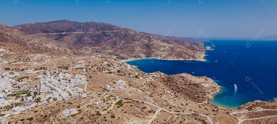 Vista aérea da costa de Chora, também conhecida como Hora, capital da ilha de Ios, na Grécia.