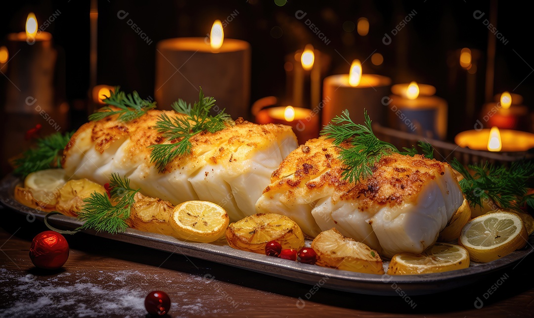 Delicioso bacalhau de Natal assado com super detalhes em uma bandej...