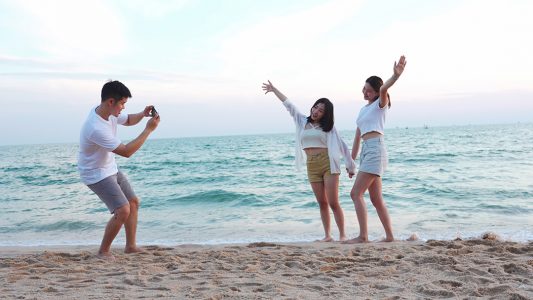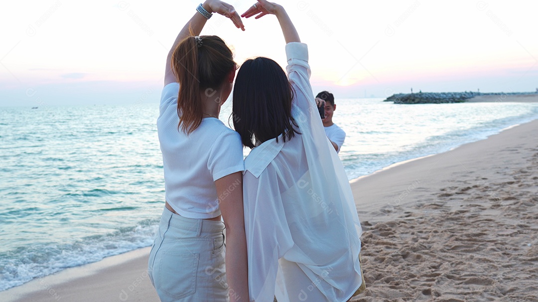 Jovem segurando câmera tirando foto de adolescentes posando na praia no verão