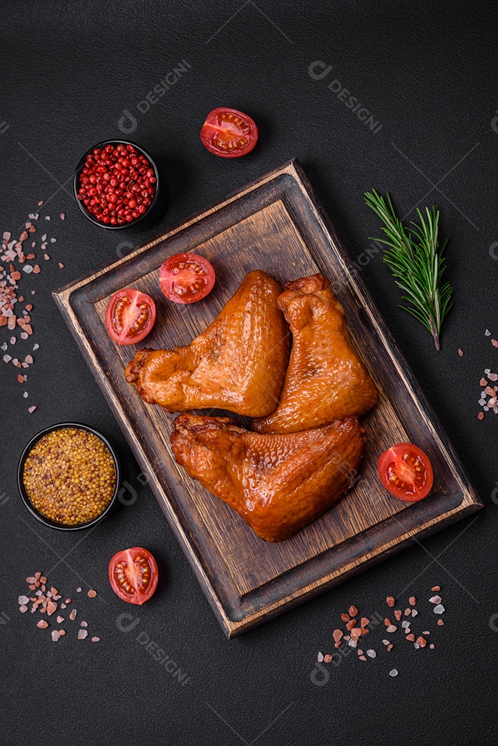 Deliciosas asas de frango grelhado com especiarias e ervas em um fundo escuro de concreto