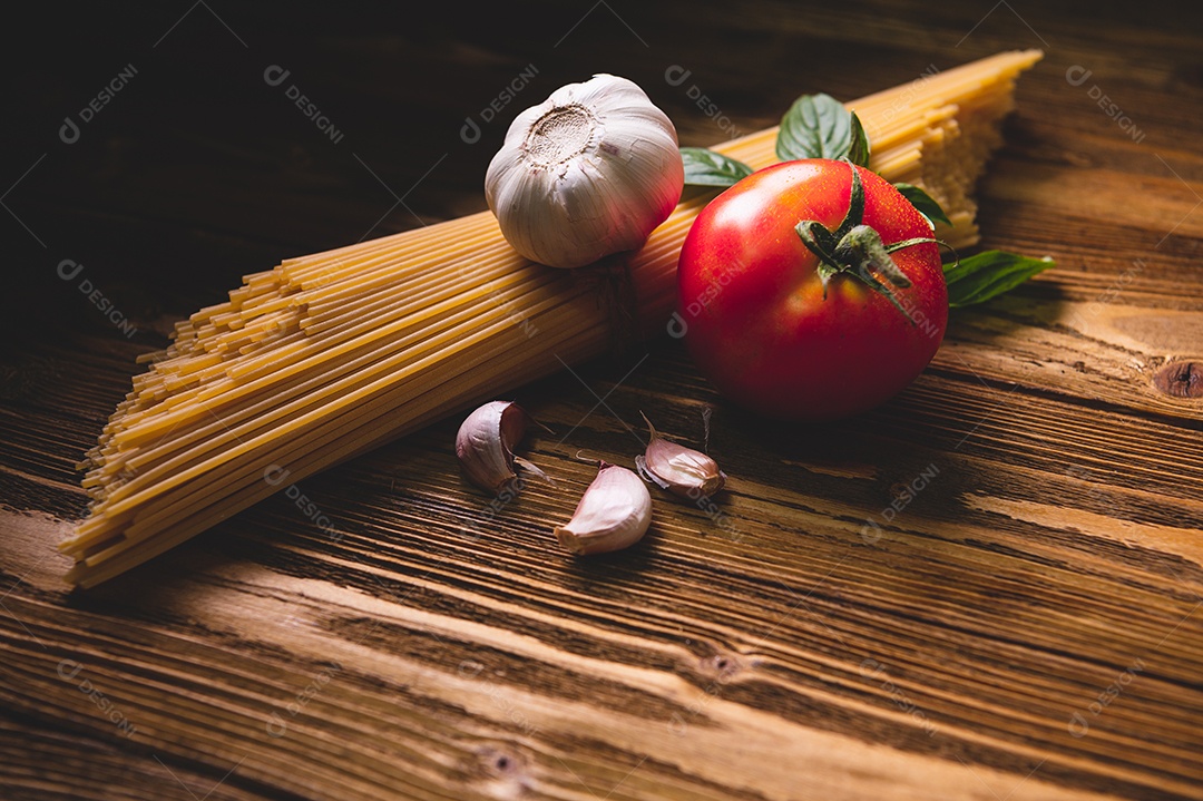 Saboroso apetitoso ingredientes de massa de espaguete italiano para cozinha.