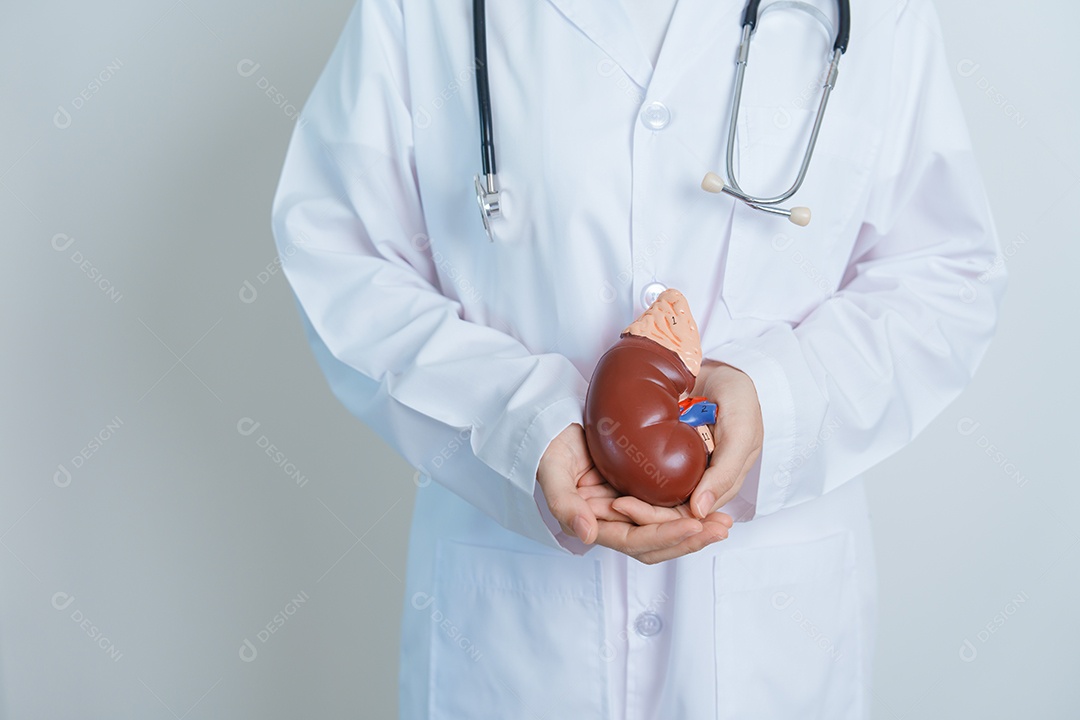 Médico segurando rim anatômico modelo de glândula adrenal.